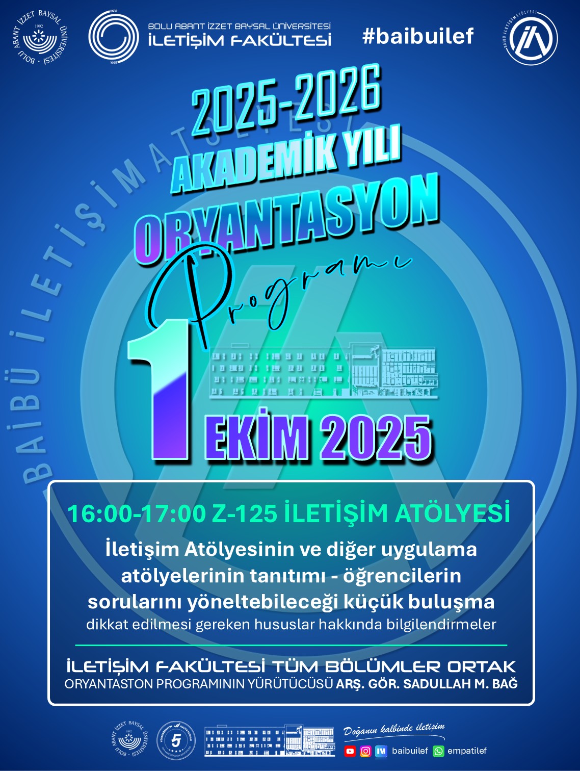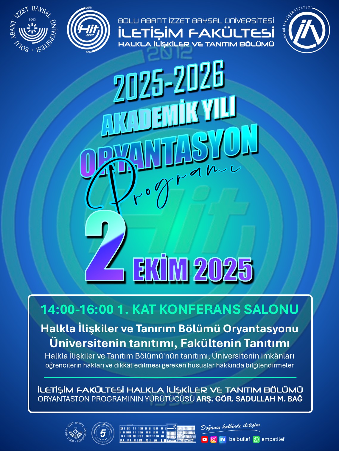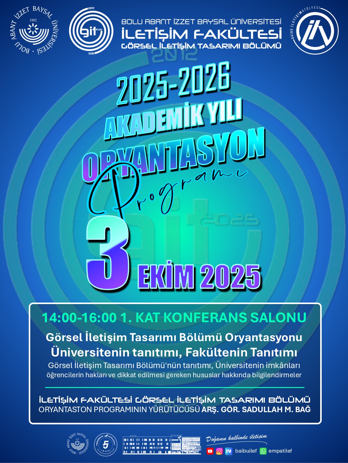 İletişim Fakültesi ailesine yeni katılan öğrencilerimizi karşılamak üzere hazırlanan 2025-2026 Güz Yarıyılı Tanıtım ve Oryantasyon Programı, dopdolu içeriğiyle başlıyor. Fakültemizin tüm bölümlerine yönelik olarak düzenlenen etkinlikler dizisi, öğrencilerimizin üniversite yaşamına uyum sağlamalarını kolaylaştırmayı, fakültemizin sunduğu imkânları yakından tanıtmayı ve öğretim elemanlarımızla öğrencilerimizi kaynaştırmayı amaçlamaktadır.