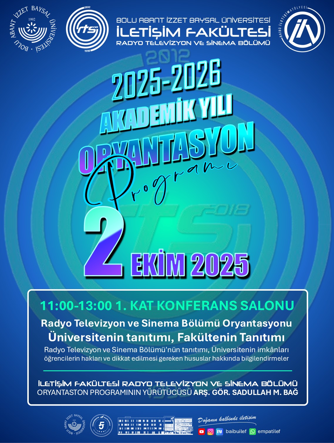 2 Ekim Perşembe günü saat 11.00’de Radyo, Televizyon ve Sinema Bölümü Oryantasyonu ve saat 14.00’te Halkla İlişkiler ve Tanıtım Bölümü Oryantasyonu yine 1. Kat Konferans Salonu’nda gerçekleştirilecektir. Her iki programda da bölüm tanıtımlarının yanı sıra, fakülte ve üniversite imkânları ile öğrencilerin haklarına ilişkin bilgilendirmeler yapılacaktır.