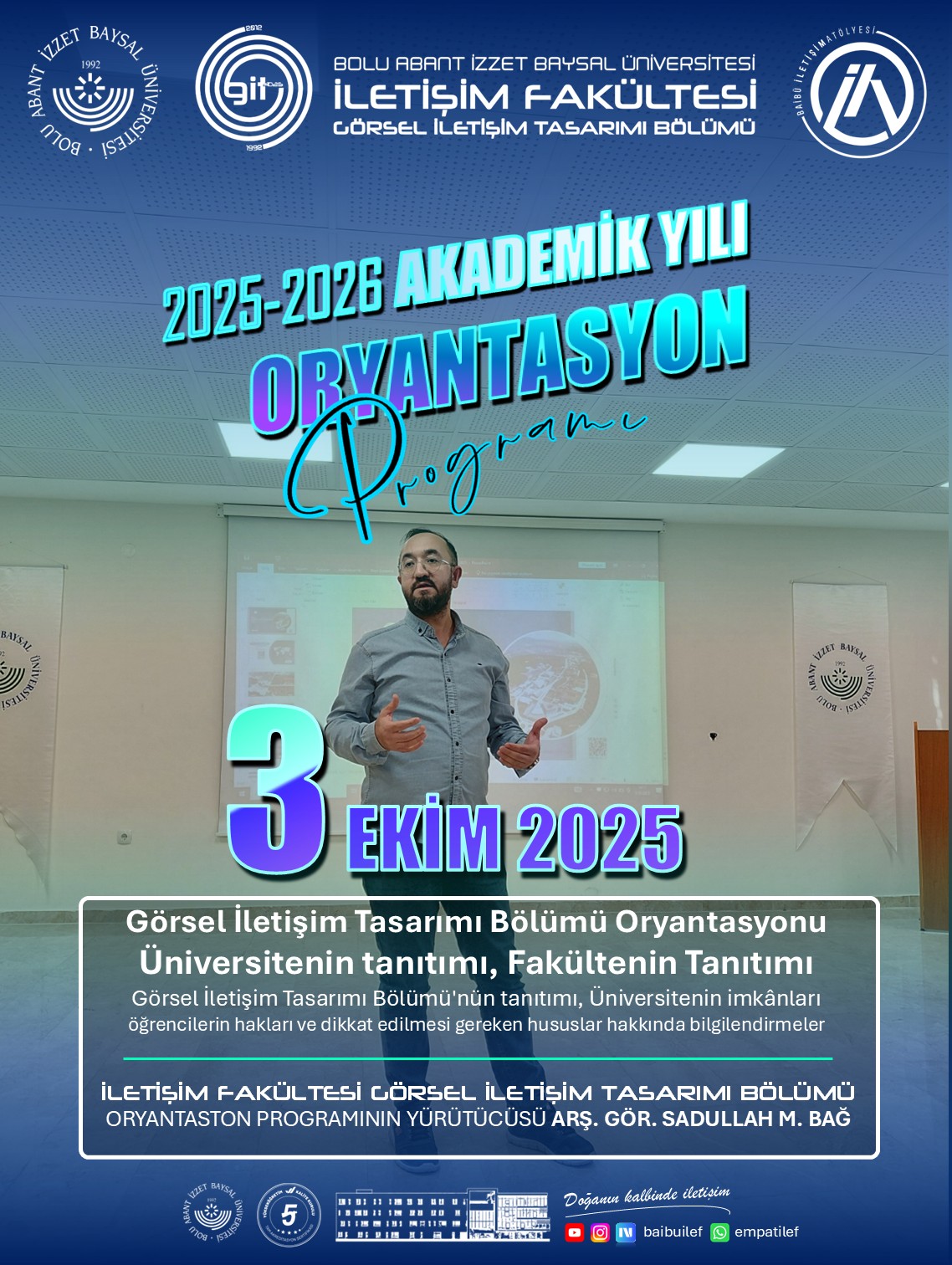 Bolu Abant İzzet Baysal Üniversitesi (BAİBÜ) İletişim Fakültesi’nde 2025-2026 Akademik Yılı Oryantasyon Haftası büyük bir coşku ve verimlilikle gerçekleştirildi. Fakülte bünyesindeki tüm bölüm tanıtımları, uygulamalı atölye programları ve Radyo Üni 14 stüdyo ziyaretleriyle dolu dolu geçen hafta, öğrenciler için hem bilgilendirici hem de ilham verici bir başlangıç oldu.