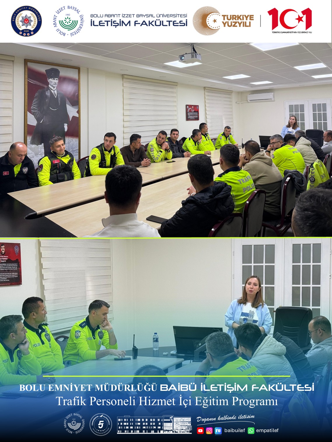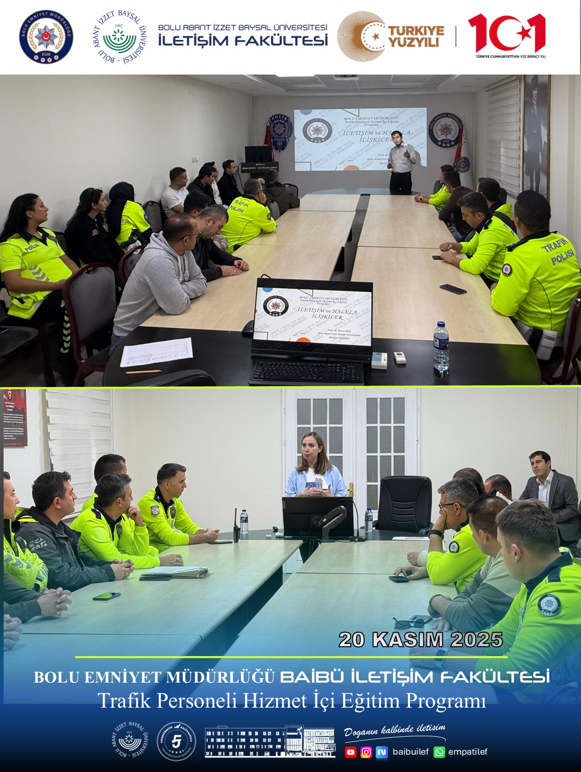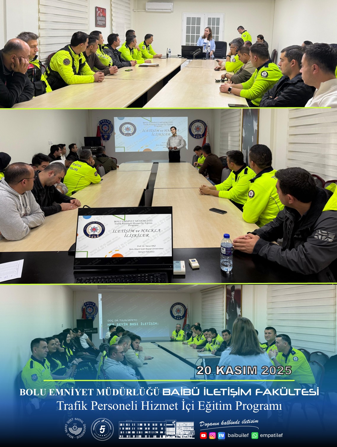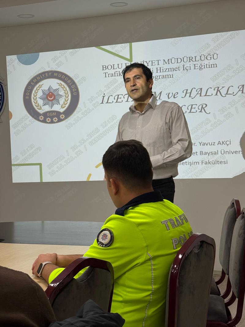 20 Kasım 2025 Perşembe günü, fakültemizin değerli akademisyenleri Prof. Dr. Yavuz AKÇİ ve Doç. Dr. Tülin SEPETCİ tarafından, Bolu İl Emniyet Müdürlüğü personeline yönelik “Trafik Denetimlerinde Halkla İlişkiler ve İletişim Eğitimi” programı başarıyla gerçekleştirildi.