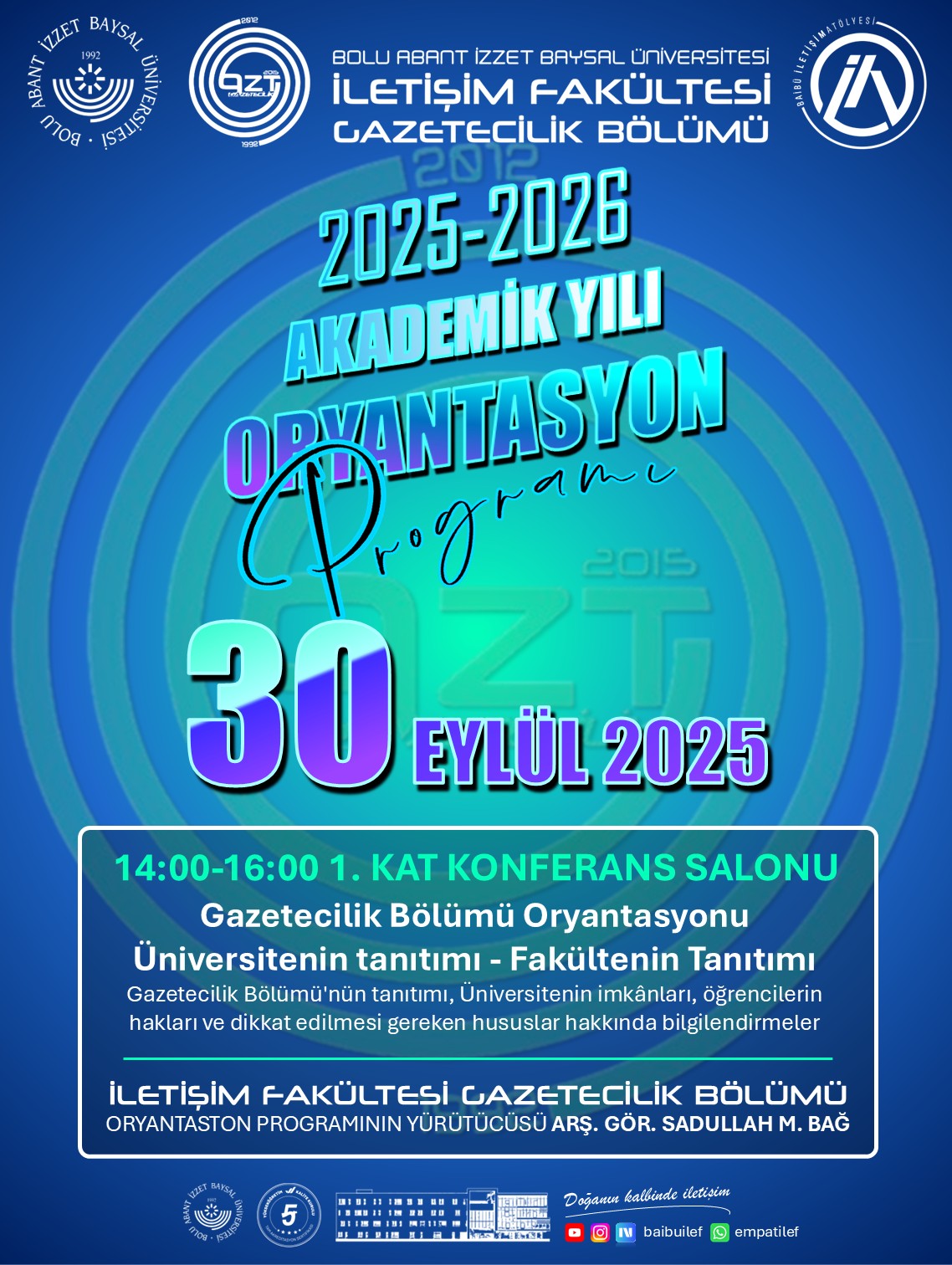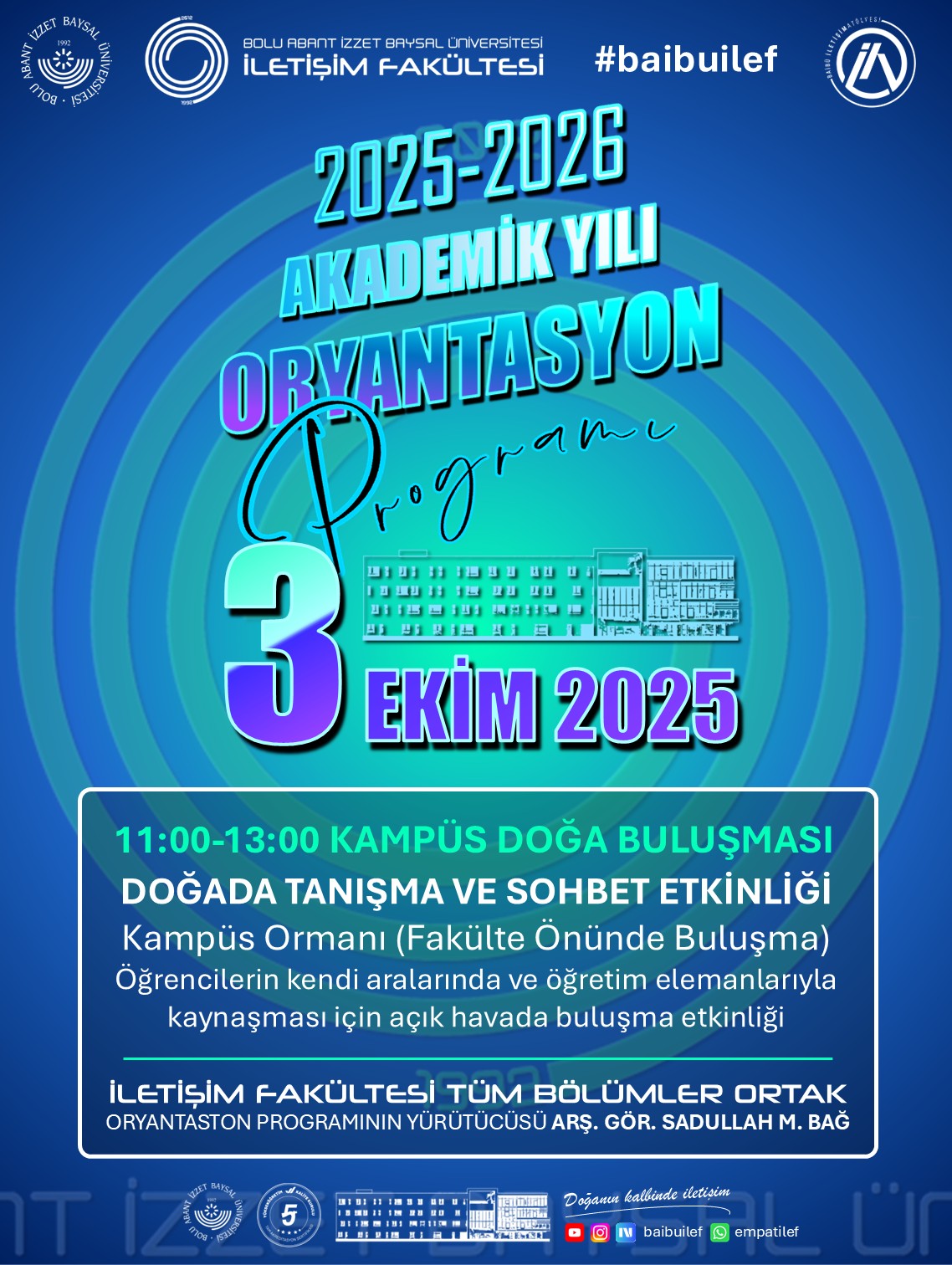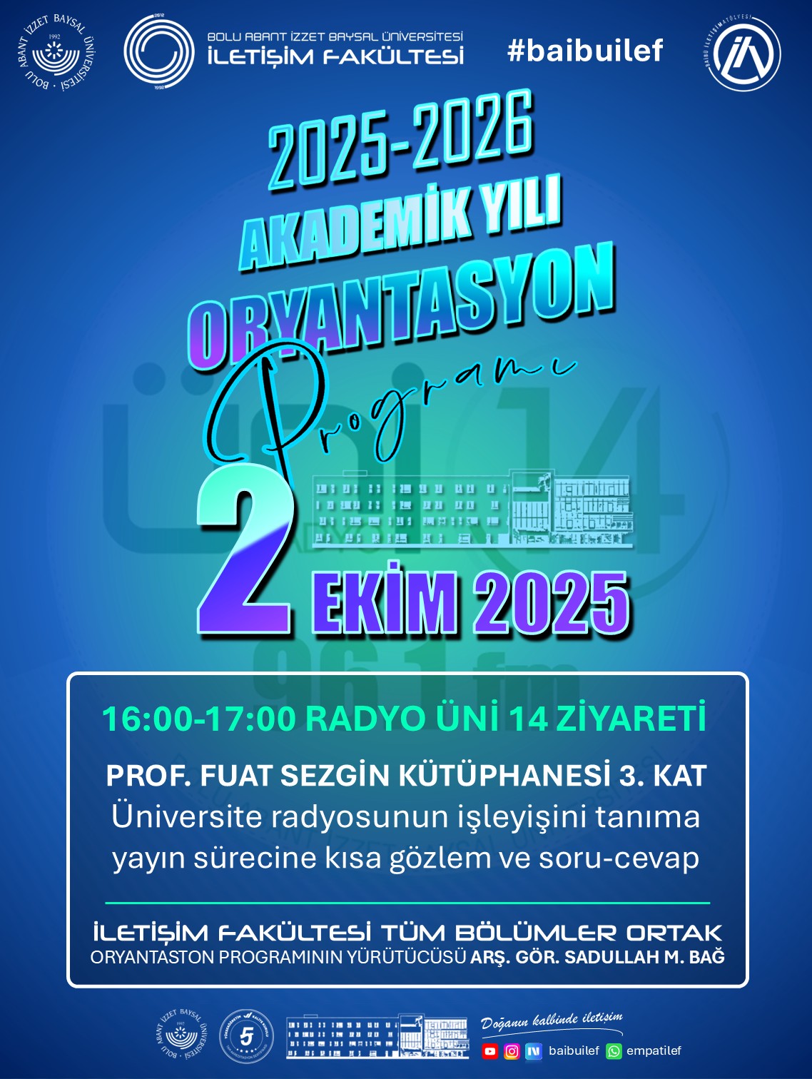 İletişim Fakültesi ailesine yeni katılan öğrencilerimizi karşılamak üzere hazırlanan 2025-2026 Güz Yarıyılı Tanıtım ve Oryantasyon Programı, dopdolu içeriğiyle başlıyor. Fakültemizin tüm bölümlerine yönelik olarak düzenlenen etkinlikler dizisi, öğrencilerimizin üniversite yaşamına uyum sağlamalarını kolaylaştırmayı, fakültemizin sunduğu imkânları yakından tanıtmayı ve öğretim elemanlarımızla öğrencilerimizi kaynaştırmayı amaçlamaktadır.