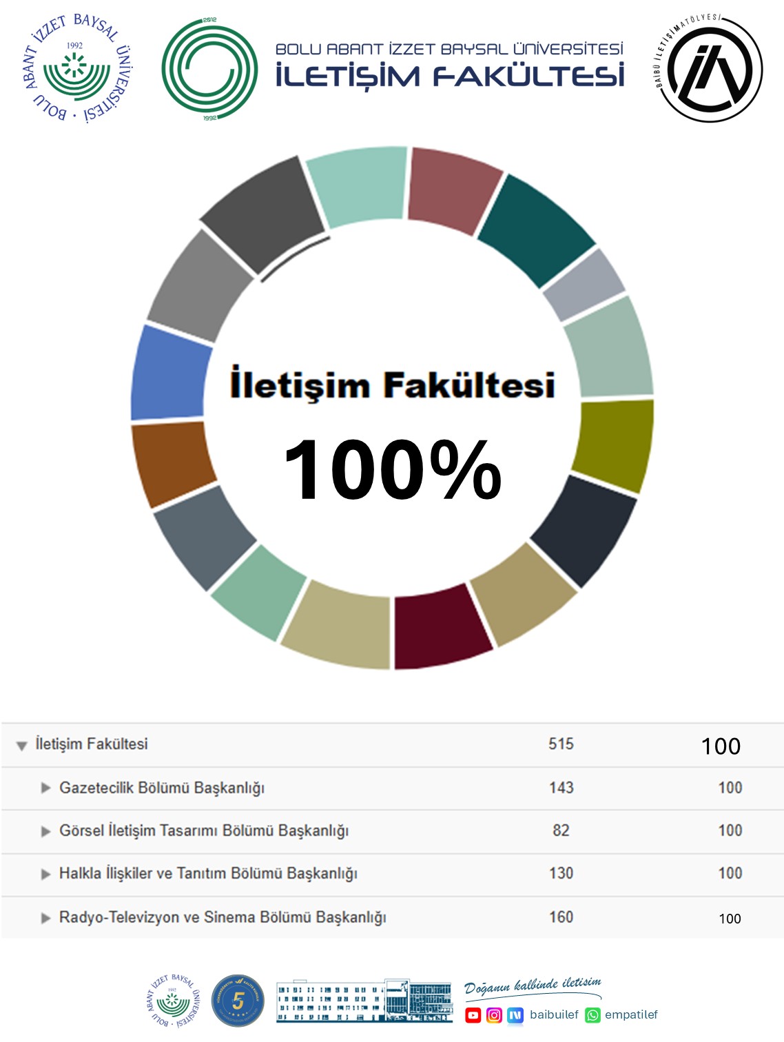 BAİBÜ İletişim Fakültesi, kazanımları ve örnek alınan kalite uygulamaları ile başarı yolculuğuna kesintisiz şekilde devam ederken, bu süreçte katkı sunan tüm akademik ve idari personeline teşekkür eder, öğrencilerimiz için daha da güçlü bir gelecek inşa etme kararlılığını bir kez daha vurgular. Her zaman daha nitelikli, daha güçlü ve daha ileri bir iletişim eğitimi için çalışmayı sürdüreceğiz.