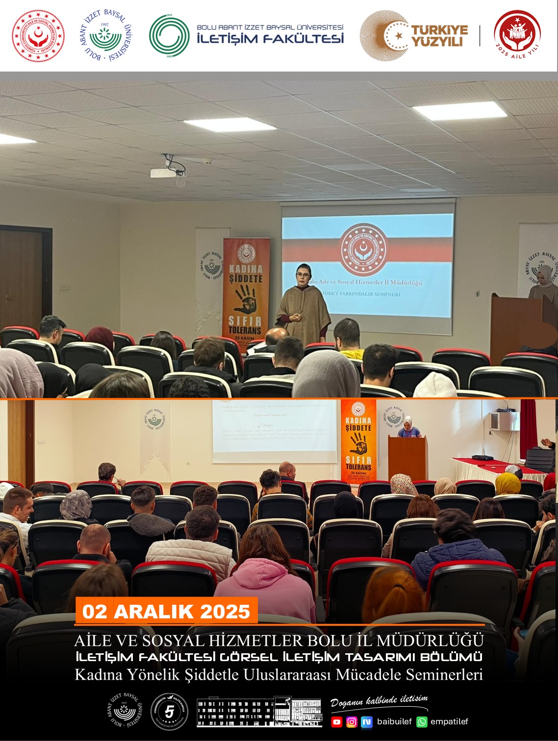 Aile ve Sosyal Hizmetler Bolu İl Müdürlüğü’ne bağlı Şiddet Önleme ve İzleme Merkezinden Eğitimci Psikolog Seçil Öztürk, “Kadına Yönelik Şiddete Karşı Uluslararası Farkındalık Seminerleri” kapsamında fakültemizin konuğu oldu.