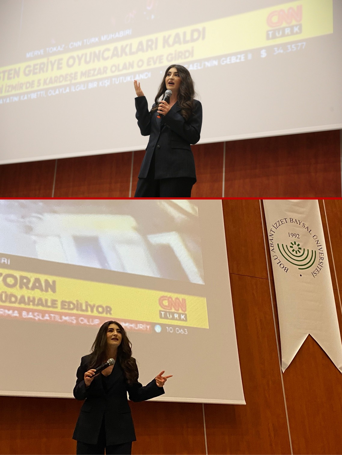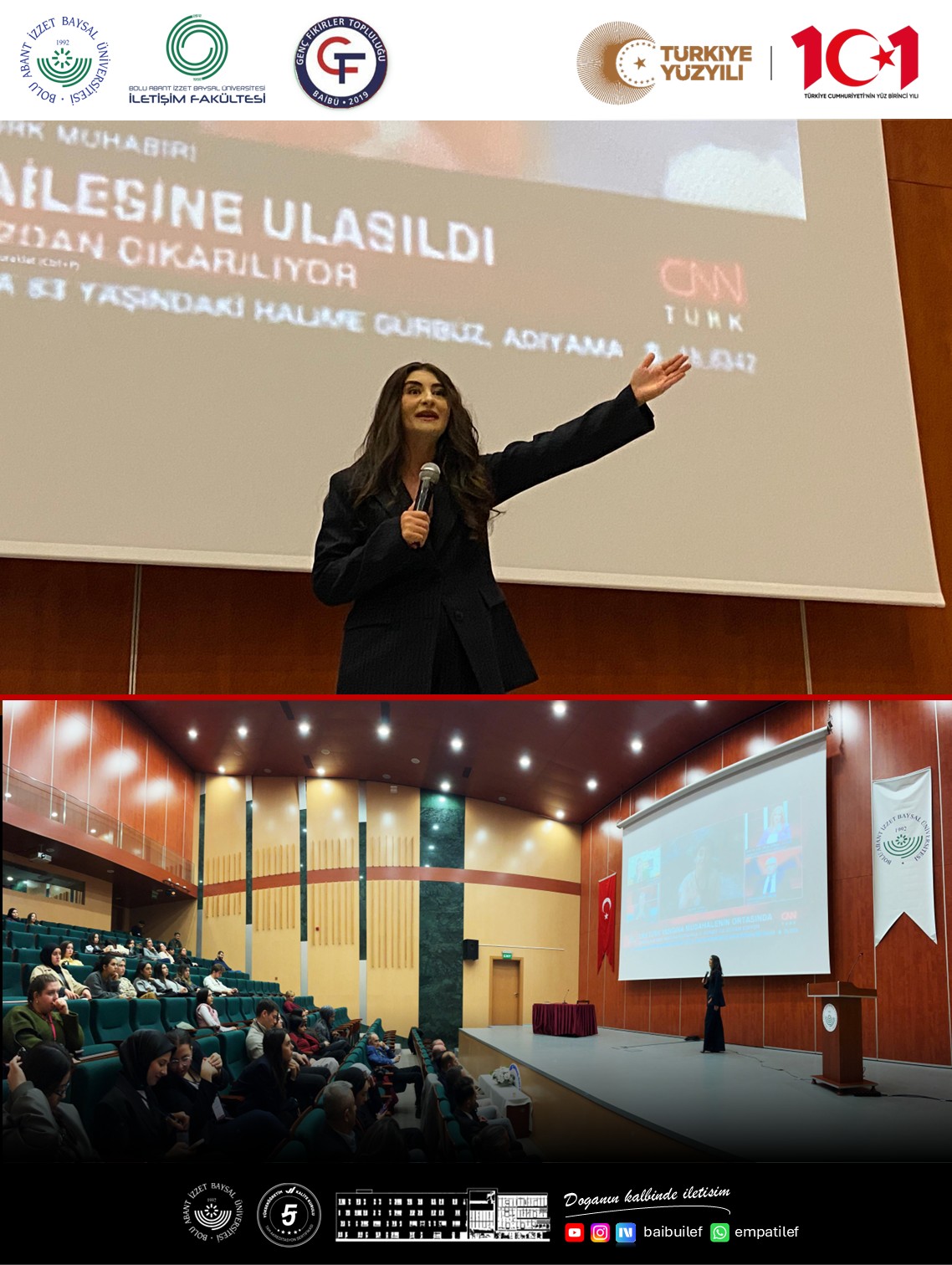 Bolu Gazeteciler ve Yazarlar Derneği ile Genç Fikirler Topluluğu tarafından düzenlenen etkinlik kapsamında, CNN TÜRK’ün genç, dinamik ve sahada aktif olarak görev yapan muhabiri Merve Tokaz, Bolu Abant İzzet Baysal Üniversitesi İletişim Fakültesi öğrencileriyle buluştu. Mesleğe dair tecrübelerini içten ve samimi bir dille aktaran Tokaz’ın söyleşisi, öğrenciler tarafından büyük ilgi gördü.