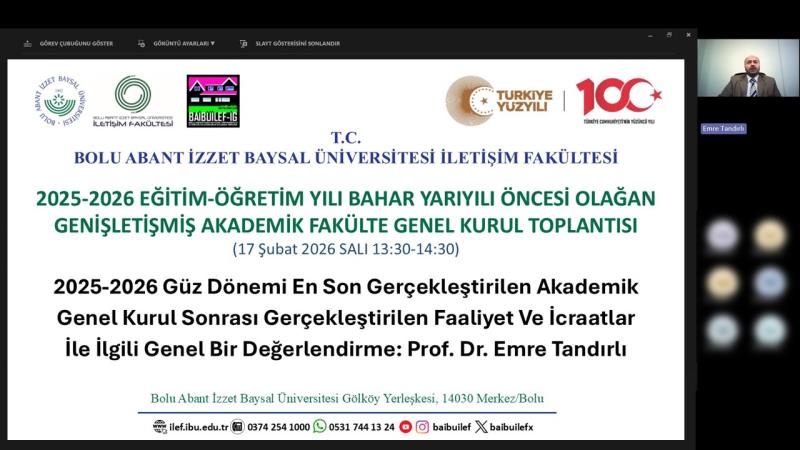 Bolu Abant İzzet Baysal Üniversitesi İletişim Fakültesi’nde 2025–2026 Akademik Yılı Bahar Dönemi öncesinde gerçekleştirilen kapsamlı değerlendirme toplantısında, ders programları, akademik faaliyetler, uluslararası çalışmalar ve kurumsal gelişim başlıkları ele alındı. Fakülte yönetimi tarafından paylaşılan ara değerlendirme raporu, hem akademik kalite hem de kurumsal işleyiş açısından önemli bir sürecin geride bırakıldığını ortaya koydu.