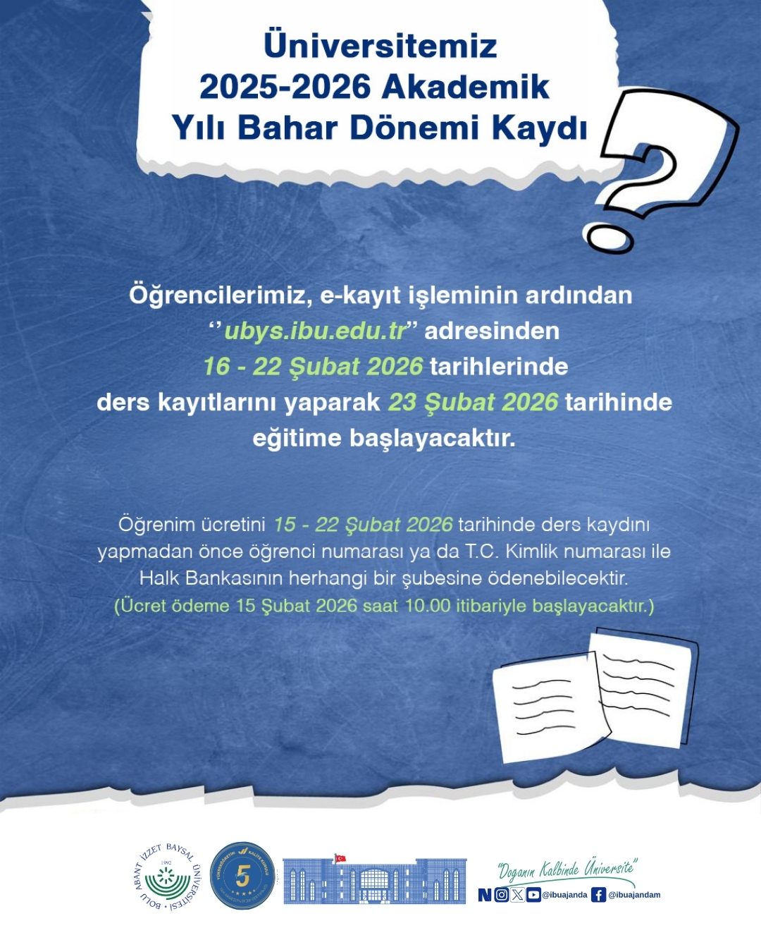 Bahar dönemi dersleri 23 Şubat 2026 tarihi itibarıyla başlayacaktır.